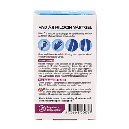Nilocin vårtgel är ett effektivt behandlingsmedel mot vårtor på fötter och händer. Nilocin vårtgel ger en effektiv och smärtfri behandling genom en enkel och säker applicering. Ett synligt resultat uppnås redan efter en vecka. Gelen innehåller en keratolytisk förening som lokalt bryter ner vävnad och därigenom tar bort vårtan.