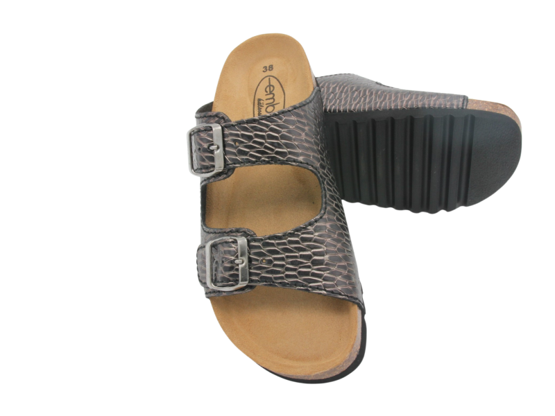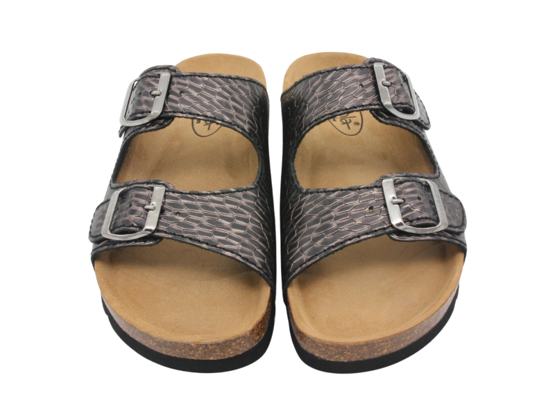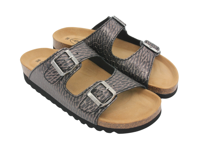 Klassisk tvåremmars damsandal i ett mjukt skinn med fodring av cambrelletyg. Korkfotbädd med anatomisk uppbyggnad med stöd för hålfoten.Fotbädden är klädd med skinn med ett mjukt sviktlager för bästa komfort. Yttersula i gummi för bra grepp. Normal i storlek.